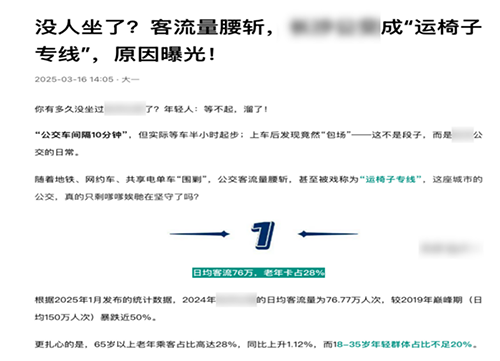 前段時(shí)間,一篇網(wǎng)絡(luò)爆文《沒人坐了?客流量腰斬,某公交成“運(yùn)椅子專線”,原因曝光!》引發(fā)熱議,文章用調(diào)侃的語(yǔ)氣生動(dòng)地反映出了當(dāng)下公交企業(yè)普遍面臨的困境。當(dāng)“運(yùn)椅子專線”、“老年專線”、“等車半小時(shí),上車包場(chǎng)兩塊錢”、“明明直線3公里,公交非要繞出個(gè)五角星”等調(diào)侃詞條沖上熱搜,一個(gè)尖銳的問題已經(jīng)浮出水面——在公交客流腰斬的新時(shí)代,公交轉(zhuǎn)型已經(jīng)不是選擇題,而是一道生死存亡的必答題。